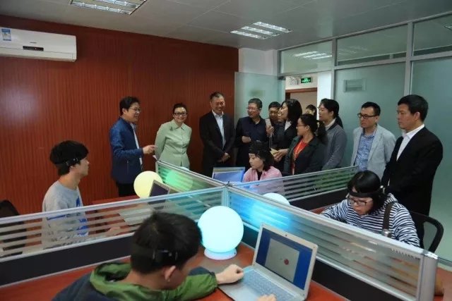 ▲深圳市残联理事长侯伊莎和宝安区委常委、统战部长郑新强参观正念减压训练系统