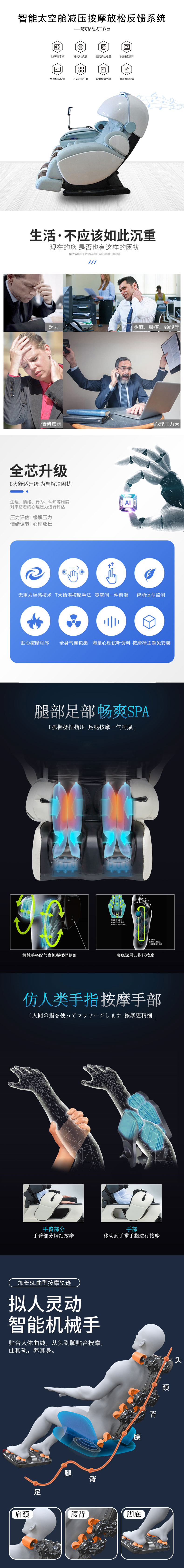 功能:1、高级智能太空舱减压按摩放松椅一台:尺寸:1560 × 1100 × 1350mm,耗电功率:280w,角度调节范围:腿部0~45,背部:90-170,多层挤压式和包裹式气囊按摩,接近人手按摩的3D复合揉捏技法:揉捏、叩击、拍打、推拿等,肩部、腿部、手臂、臀部均配有多层挤压式和包裹式气囊